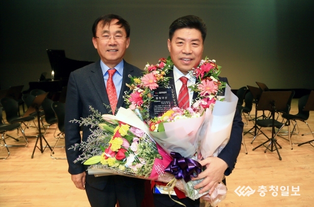 37회 충북 시·군대항 역전마라톤대회 개회식 및 8회 충청대상 시상식이 열린 10일 단양 문화예술회관에서 이규택 충청일보 회장이 지역경제 부문을 수상한 김정복 흥덕새마을금고 이사장과 기념촬영을 하고 있다. /권보람기자