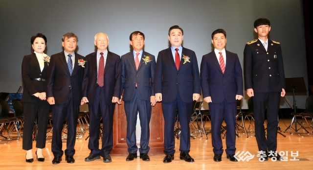 37회 충북 시·군대항 역전마라톤대회 개회식 및 8회 충청대상 시상식이 열린 10일 단양 문화예술회관에서 충청대상 수상자들과 충청일보 임원들이 기념촬영을 하고 있다. 왼쪽부터 윤경희 총괄이사·박장규 전무이사·이은영 재단법인 희영장학회 이사장·이규택 충청일보 회장·김정구 충북도민회 중앙회 수석부회장·김정복 흥덕새마을금고 이사장·김남수 소방관. /권보람기자