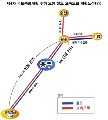 한편, 지난달 23일 오는 2019년까지의 국가기간교통망 수정계획 중간보고회를 가진 한국교통연구원은 강원도 원주와 충북 충주, 행정중심복합도시를 잇는 가칭 충청고속도로가 국가기간교통망 수정계획 검토대상에 포함됐고 충주와 원주를 잇는 철도건설 사업도 타당성 검증에 돌입했다고 발표했다.