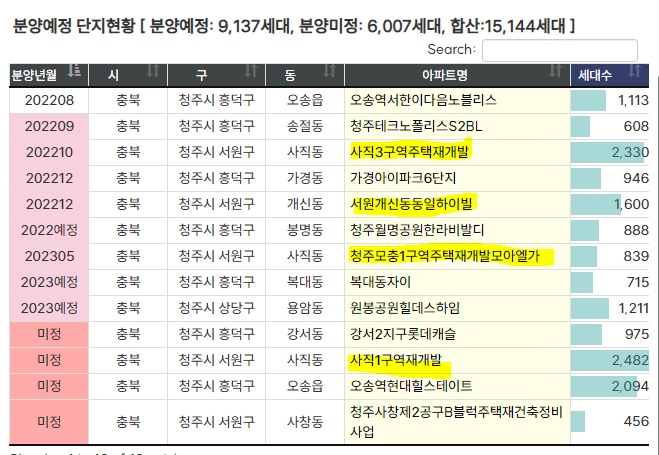 이런 상황에서 충북 청주의경우도 구도심 사모구역주택재개발사업을 중심으로 9167세대의 입주예정물량이 대기중이기 때문에 청주주택시장의 여러 개발호재(청주인구증가/공단일자리증가등)에도 불구하고 향후 주택시장의 거래량을 동반한 주택시장의 경기회복을 논하기란 쉽지 않다