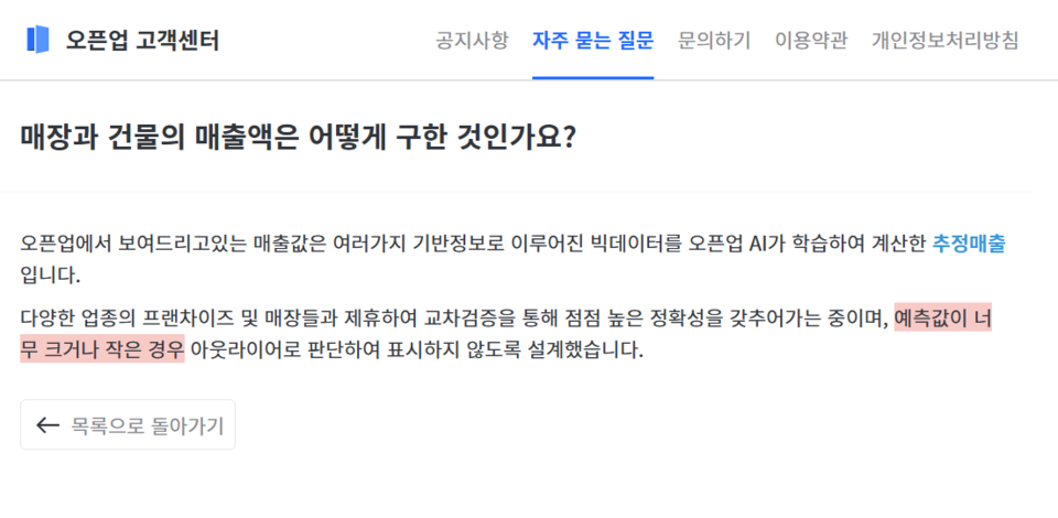 오픈업의 매출값은 여러가지 기반 정보를 활용해서 AI가 계산한 추정 매출이기 때문에 실제와 다를 수 있다. 다만, 각지점 매출의 많고 적음을 비교하기에는 이만큼 괜찮은 데이터가 없을 듯하여 활용해보기로 했다.