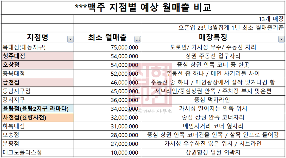 청주에는 15개 내외의 지점이 운영 중인데 일부 매장의 매출액이 검색되지 않아 13곳만 정리해보았다.
