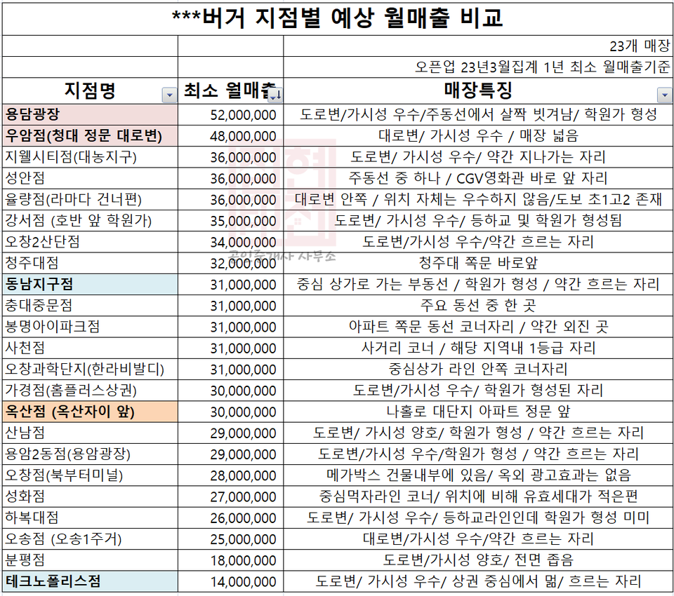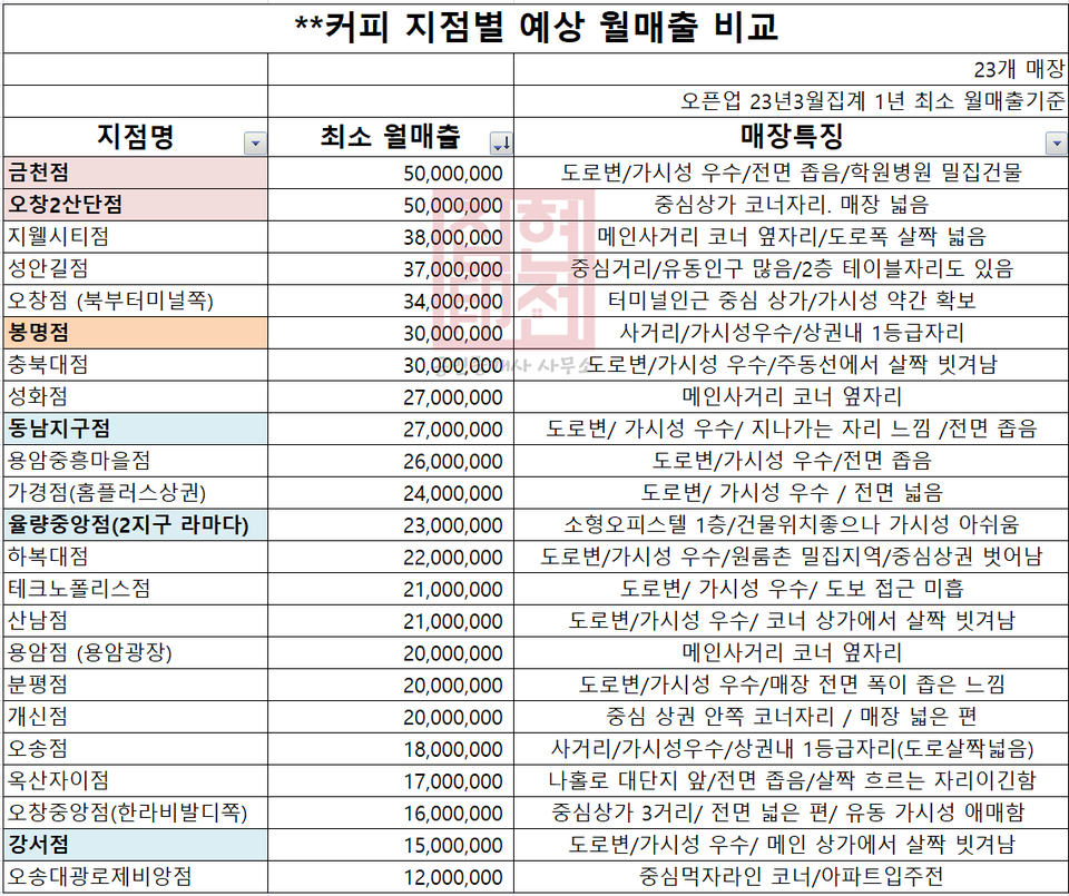 해당 프랜차이즈는 청주에 30개 이상의 매장이 운영 중인데 그 중 주요 상권으로 분류될 만한 23개 지점의 매출액이 많은 순서대로 정리해보았다.