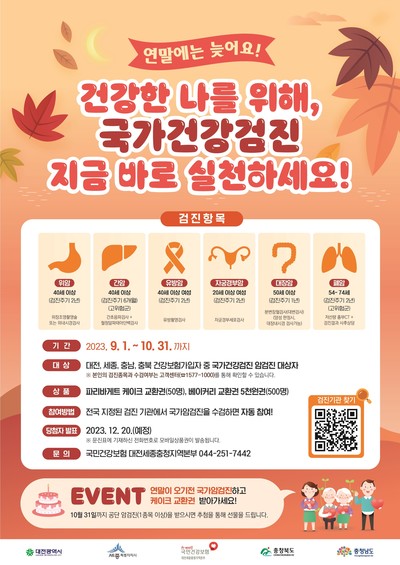이번 이벤트는 '건강한 나를 위해, 국가건강검진 지금 바로 실천하세요!'를 테마로 대전·세종·충남·충북지역 건강보험 가입자를 대상으로 한다.