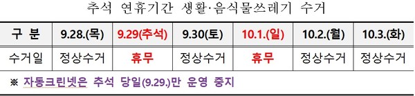 이밖에는 평시와 같이 정상 수거하며, 자동크린넷을 이용하는 동(洞)지역은 추석 당일만 운영을 중지한다.