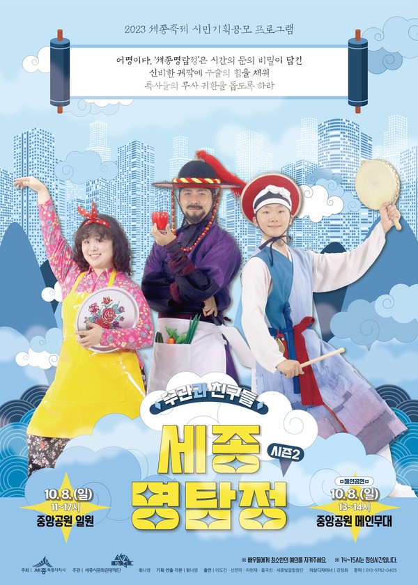 쌍방향 소통극 '세종명탐정 시즌2, 무관과 친구들'은 시간여행자 무관의 귀환을 돕기 위해 시민과 함께 미션을 수행하고 국악, 합창 등 공연을 통해 즐거움을 선사한다.