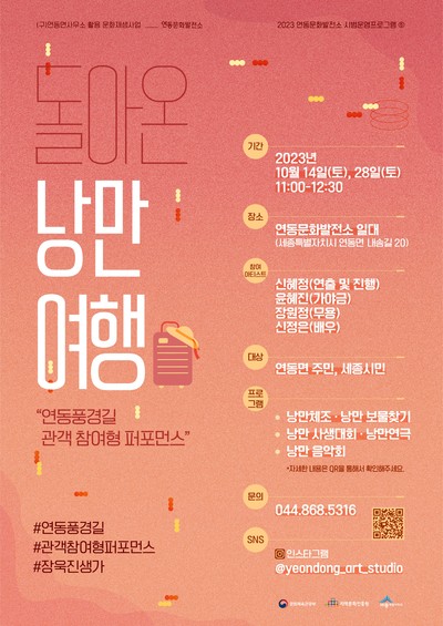프로그램 참여는 사전예약을 통해 참가할 수 있으며, 자세한 사항은 시청 누리집과 연동문화발전소 사회누리소통망(인스타그램@yeondong_art_studio)을 통해 확인하면 된다.(☏044-868-5316)