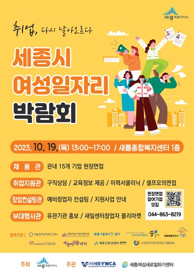 세종시가 10월 19일 새롬종합복지센터에서 '세종시 여성일자리 박람회'를 열고, 취업난과 경력 단절의 어려움을 겪고 있는 여성의 취·창업을 지원한다.