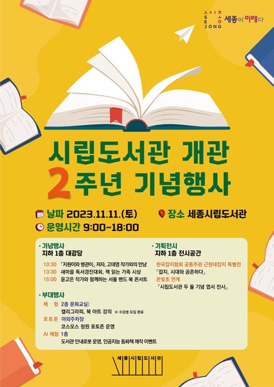 세종시립도서관이 개관 2주년인 11월 11일을 기념해 도서관 대강당에서 저자 강연과 북 콘서트를 진행한다.