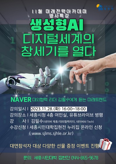 세종시가 생성형 인공지능(AI) 분야 전문가를 초청, 미래 변화상을 알아보는 강연을 11월 28일 오후 4시부터 시청 4층 여민실에서 개최한다.