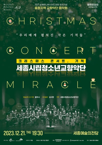 세종시립청소년교향악단(단장 최민호)이 12월 21일 오후 7시 30분 세종예술의전당에서 '크리스마스 콘서트, 기적'을 개최한다.