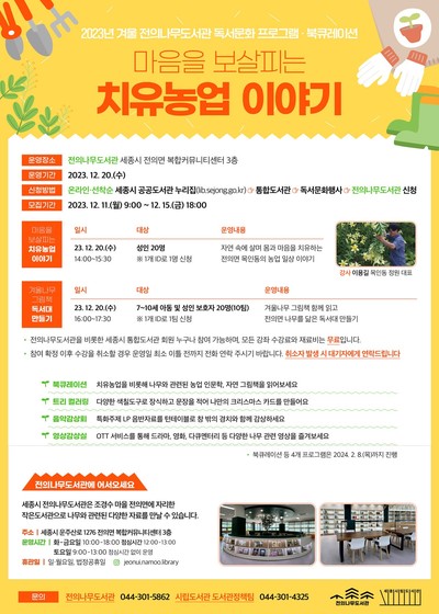 이번 프로그램은 2024년 2월 8일까지 전의면복합커뮤니티센터 3층 전의나무도서관에서 전 연령을 대상으로 치유 농업과 독서대 만들기 등 2개 강좌와 1개 전시로 운영된다.