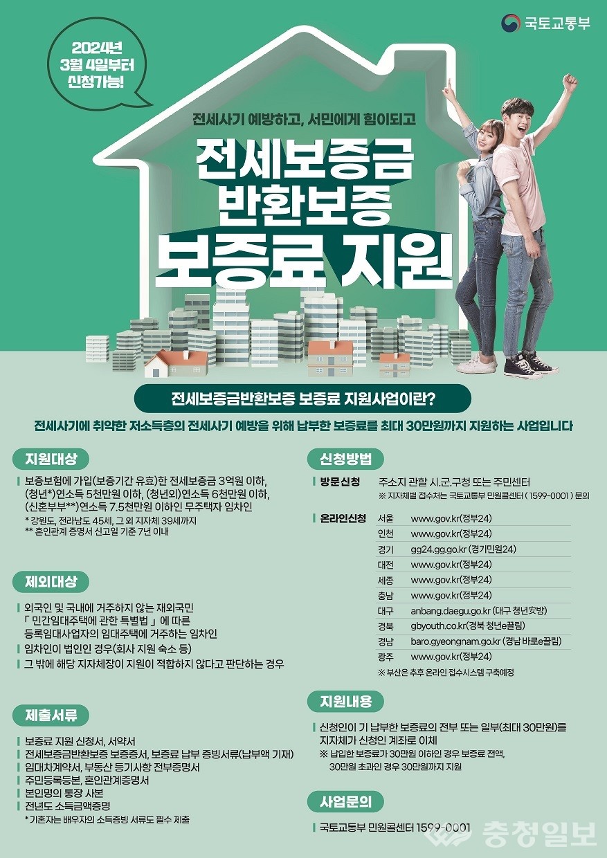 충북 옥천군은 전세 사기 피해 최소화를 위해 전세보증금반환보증 보험료 지원대상을 확대한다고 7일 밝혔다.