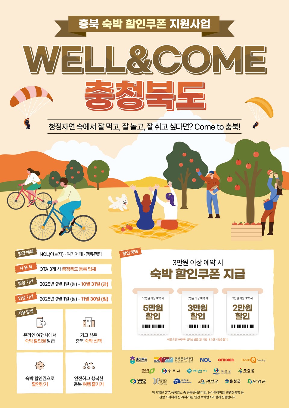 충북도가 11개 시·군, 충북문화재단과 함께 9월 1일부터 10월 31일까지 ‘충북 숙박할인쿠폰 지원사업’ 2차 기획전을 진행한다.