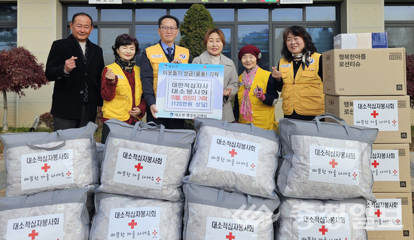 충북 음성군 대소면 대소적십자봉사회(회장 반화용)에서는 지역 내 어려운 이웃을 위해 전달해 달라며 대소면행정복지센터에 이불과 화장지 등 생필품(120만원 상당)을 기탁했다고 20일 밝혔다. /음성=김록현기자