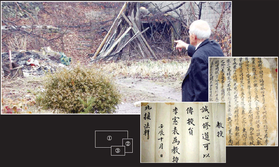 | ▲① 음성 되자니(道晴理)는 동학혁명군의 마지막 저항지다.이곳은 최시형이 1878년 육임소 박해 때 은거했던 곳이기도 하다. ② 동학 연구가 이기준씨가 그 자리를 가리키고 있다. 동학혁명 뒤 향반사회의 갈등이 기록돼 있는 李郭抱寃錄(이곽포원록) ③ 괴산접주 이헌표는 양반신분이면서도 동학에 입도하여 지도자로서 활약했다. 그에 대한 자료는 이름뿐 어디서도 찾아볼 수 없다. |