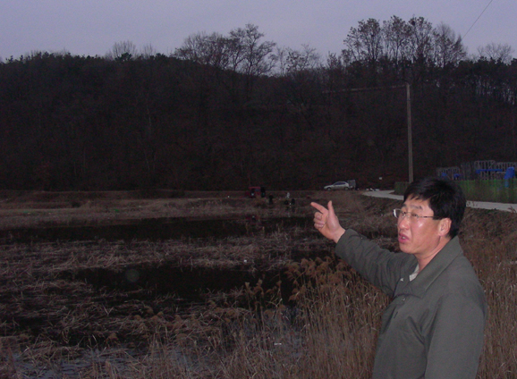 | ▲예산관작 전투지를 가리키는 박성욱씨. 그는 향토사학자로 관작전투지 상황을 낱낱이 꿰고 있었다 | |