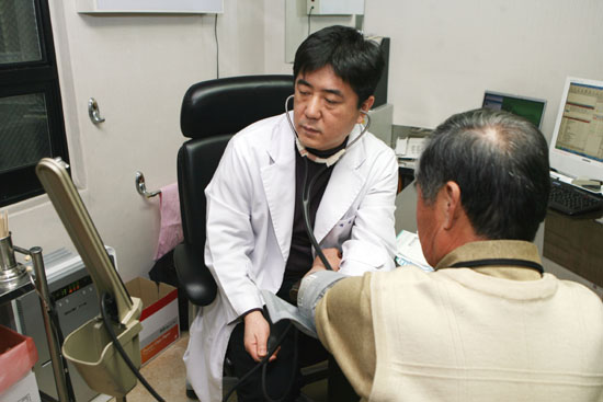 | ▲류마티스질환은 그 증상이 다양하게 나타난다. 원인모를 발열 무력감 근력감소 등의 증세가 보이면 한번 의심해 볼 필요가 있다. 사진은 박남규내과 원장이 환자를 진료하고 있는 모습. |