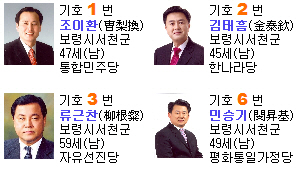 보령·서천은 통합민주당 조이환, 한나라당 김태흠, 자유선진당 류근찬, 평화통일가정당 민승기 후보 등 4명이 18대 국회의원 선거에 나서고 있다. 이중 주목할 만한 후보는 지난 17대 총선에서 일전을 치룬바 있는 자유선진당 류근찬 후보와 한나라당 김태흠 후보.당시 류후보는 30,569표를 얻어 5,071표를 얻는데 그친 김후보를 큰 표차로 따돌리고 여의도에 입성했다. 김후보에게는 이번 선거가 복수전인 셈이다.