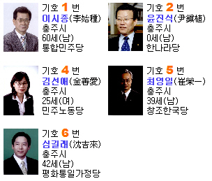 4·9총선에 5명의 후보가 도전장을 던진 '중원(中原)의 결투장', 충주시선거구는 통합민주당의 독주 속에 1강(强) 1중(中) 3약(弱)의 구도로 집약된다.충주에서는 통합민주당 이시종 후보(61)와 한나라당 윤진식(62), 민주노동당 김선애(25), 창조한국당 최영일(29), 평화통일가정당 심길래 후보(42) 등 모두 5명이 출사표를 던졌다.