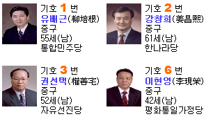 중구에는 통합민주당 유배근, 한나라당 강창희, 자유선진당 권선택, 평화통일가정당 이현영 후보 등 모두 4명이 출마했지만 유권자의 관심은 현역의원인 자유선진당 권선택 후보의 수성이냐, 6선에 재도전하는 한나라당 강창희 후보에게 모아지고 있다.