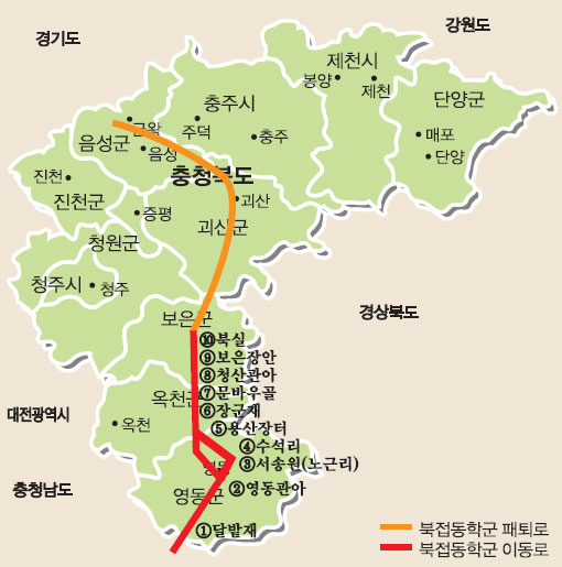한편, 무주를 떠나 영동으로 들어온 북접동학혁명군은 영동과 황간 관아를 점령한다. 북접동학혁명군은 충청도와 경상도 두 진출 방향을 두고 갈등이 있었지만 상원영차랑(桑原榮次郞)이 지휘하는 낙동병참부에서 일본군이 출동했다는 경상도 길을 포기하고